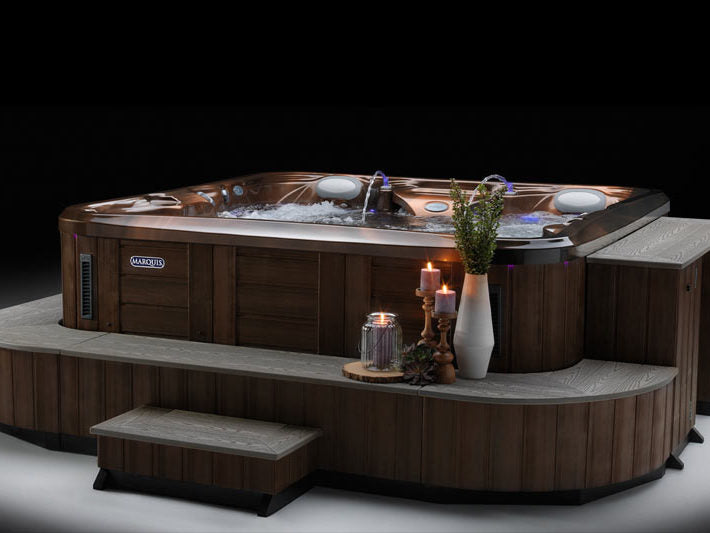 Marquis Environments™ add functionality and amenity to your hot tub area. The perfect complement to your Marquis hot tub, sharing its color palette and design cues. Depending on which hot tub model you select, a selection of steps and benches may be combined to achieve a custom look. Select benches also provide extra storage.